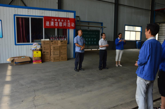 7月18日上午,烈日炎炎,為確保安全生產(chǎn),加強防暑降溫,保障工人的身體健康。萬榮縣總工會主席李廷玉及慰問組工作人員一行,給高溫酷暑下仍堅持在一線的職工們帶來防暑用品及生活用品。