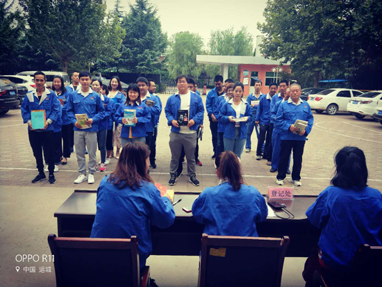 全體員工在辦公樓前舉行捐書(shū)儀式